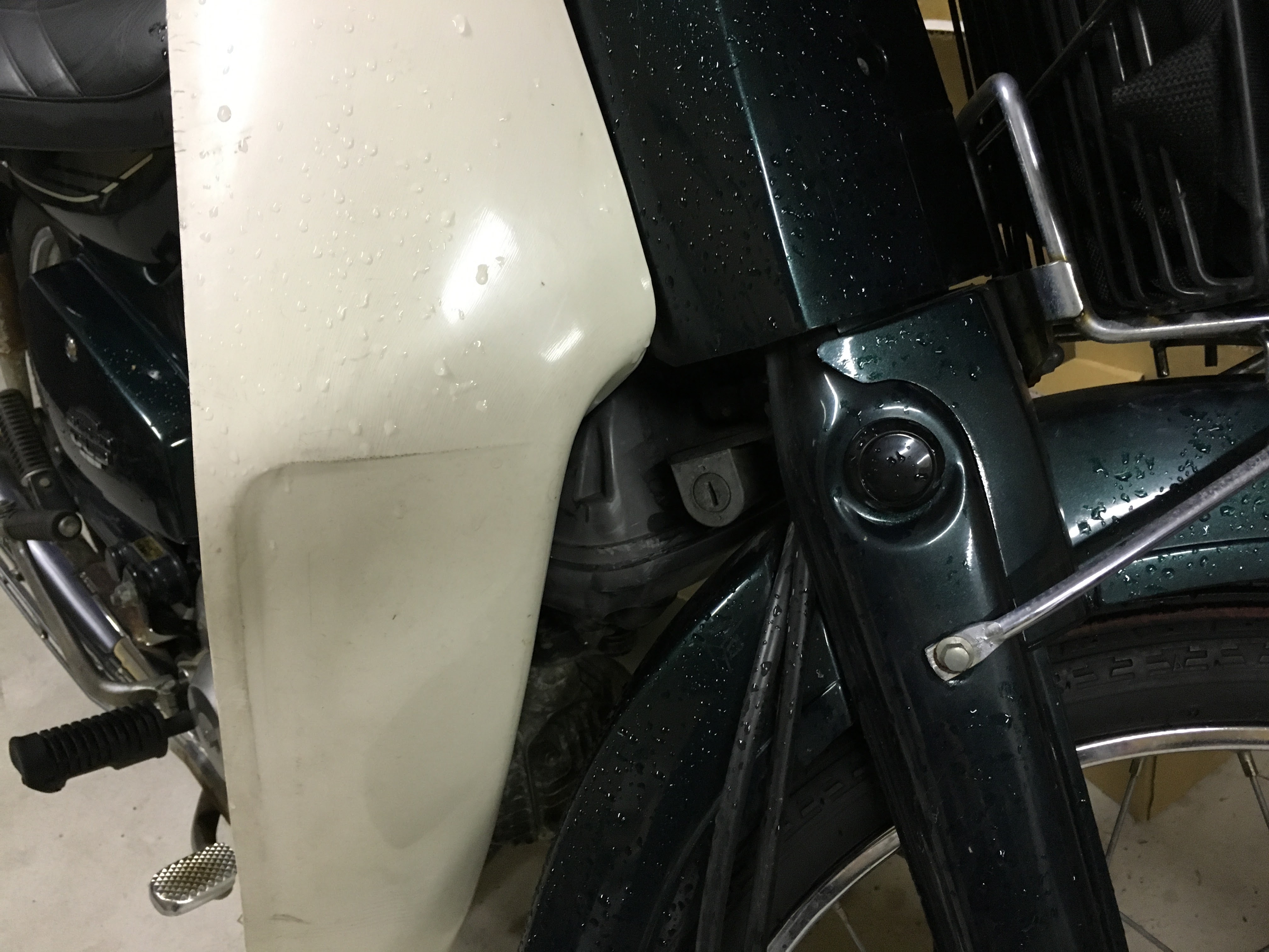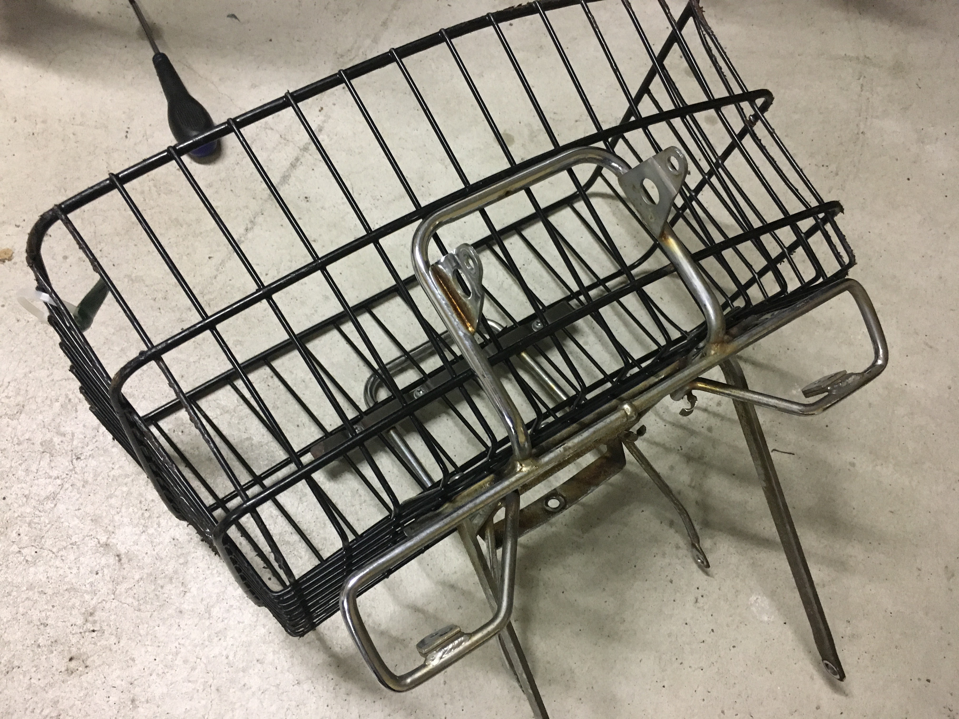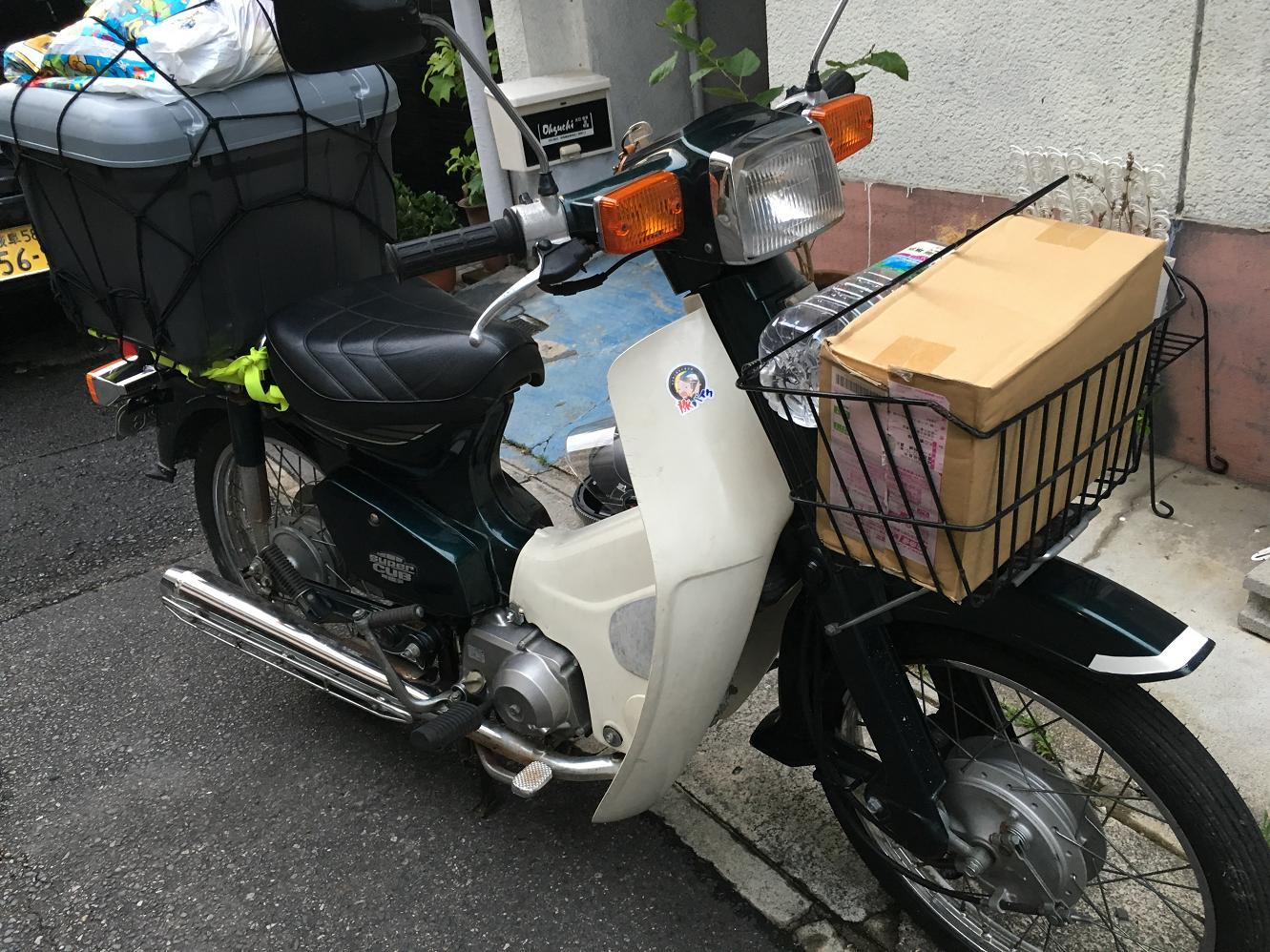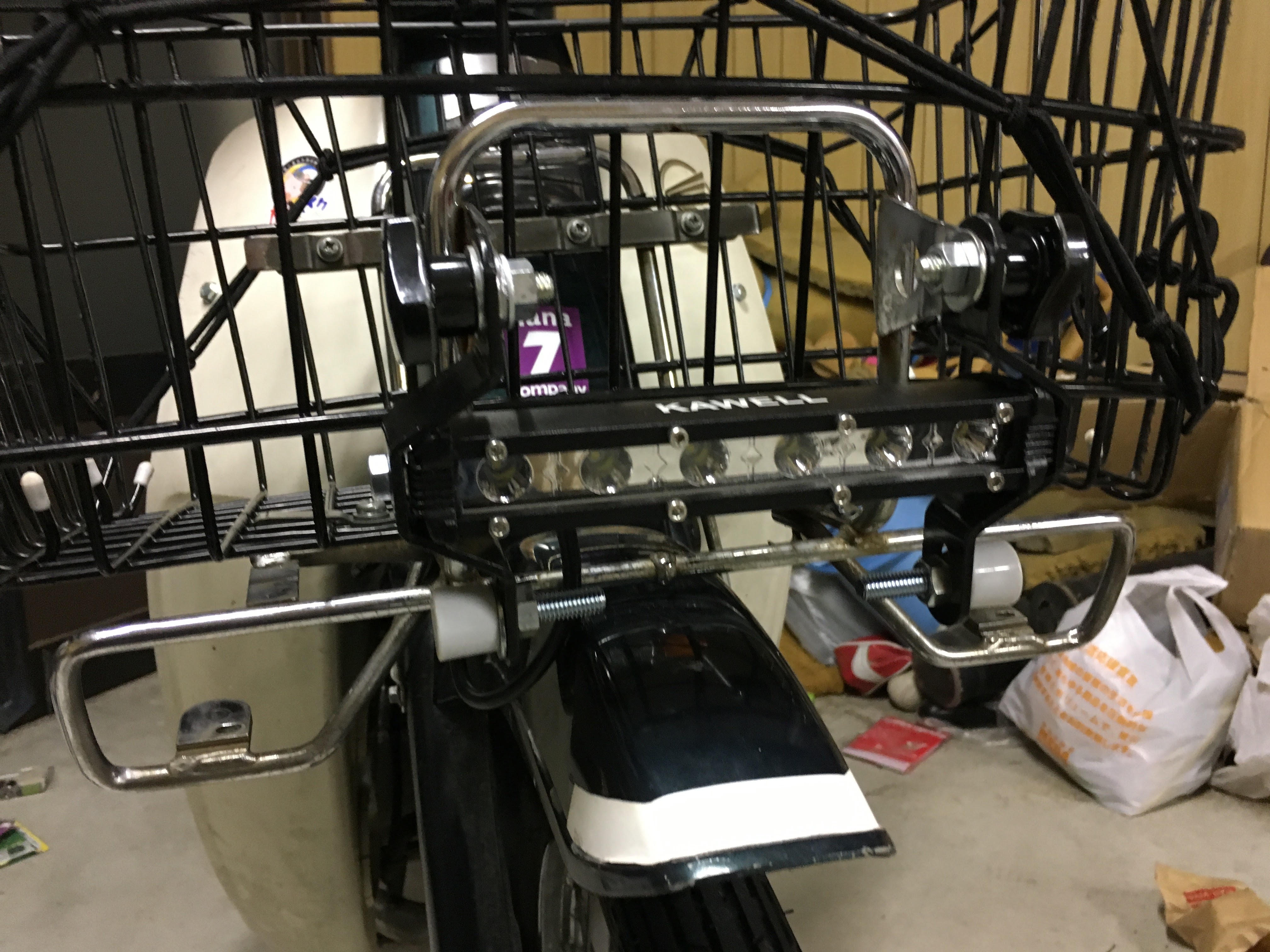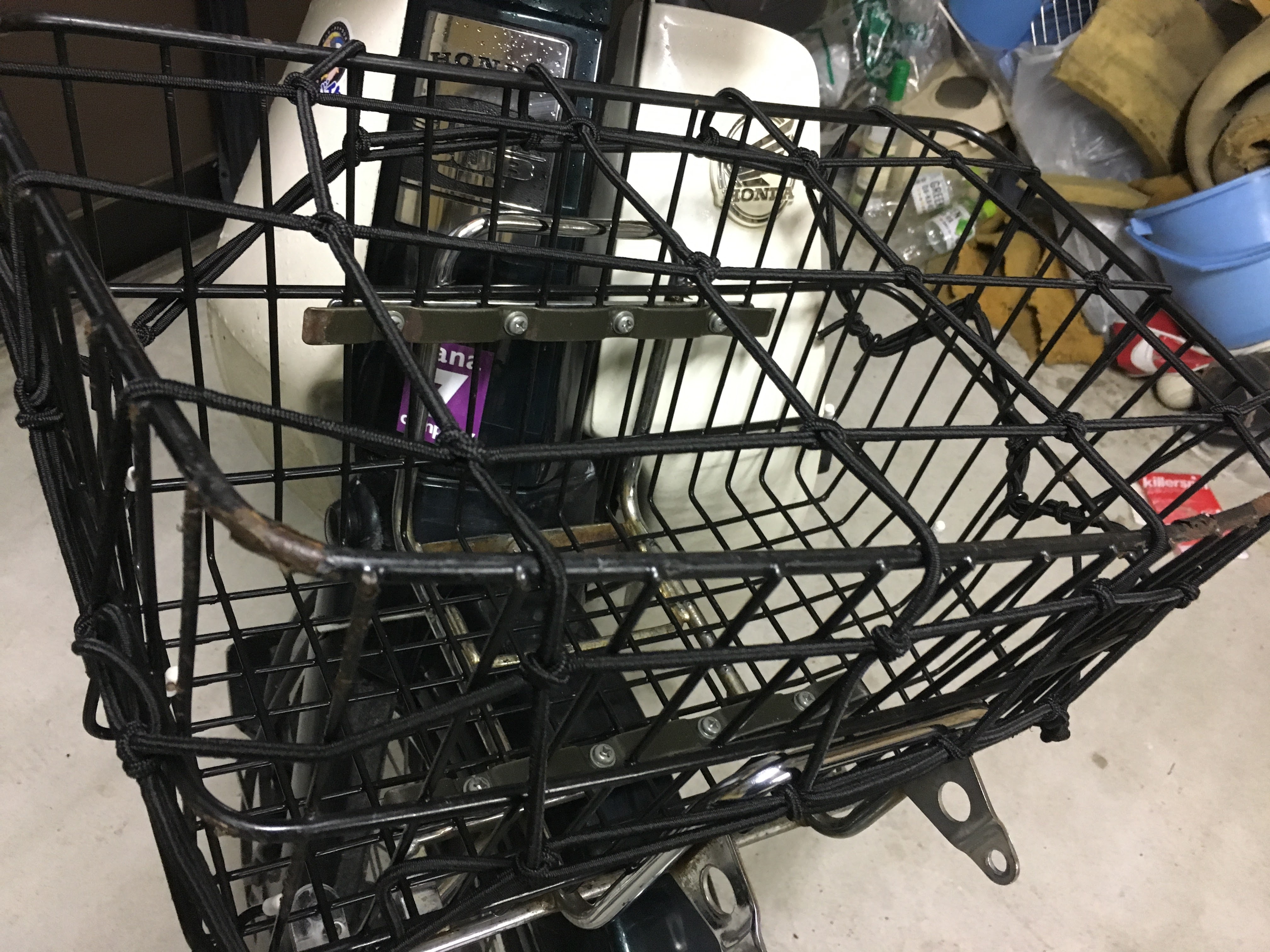 フロントのカゴは外して、プレスカブの丸目ランプ付キャリア(カゴ無し)に交換しようと思ってたんですけどね、カゴが便利だった。