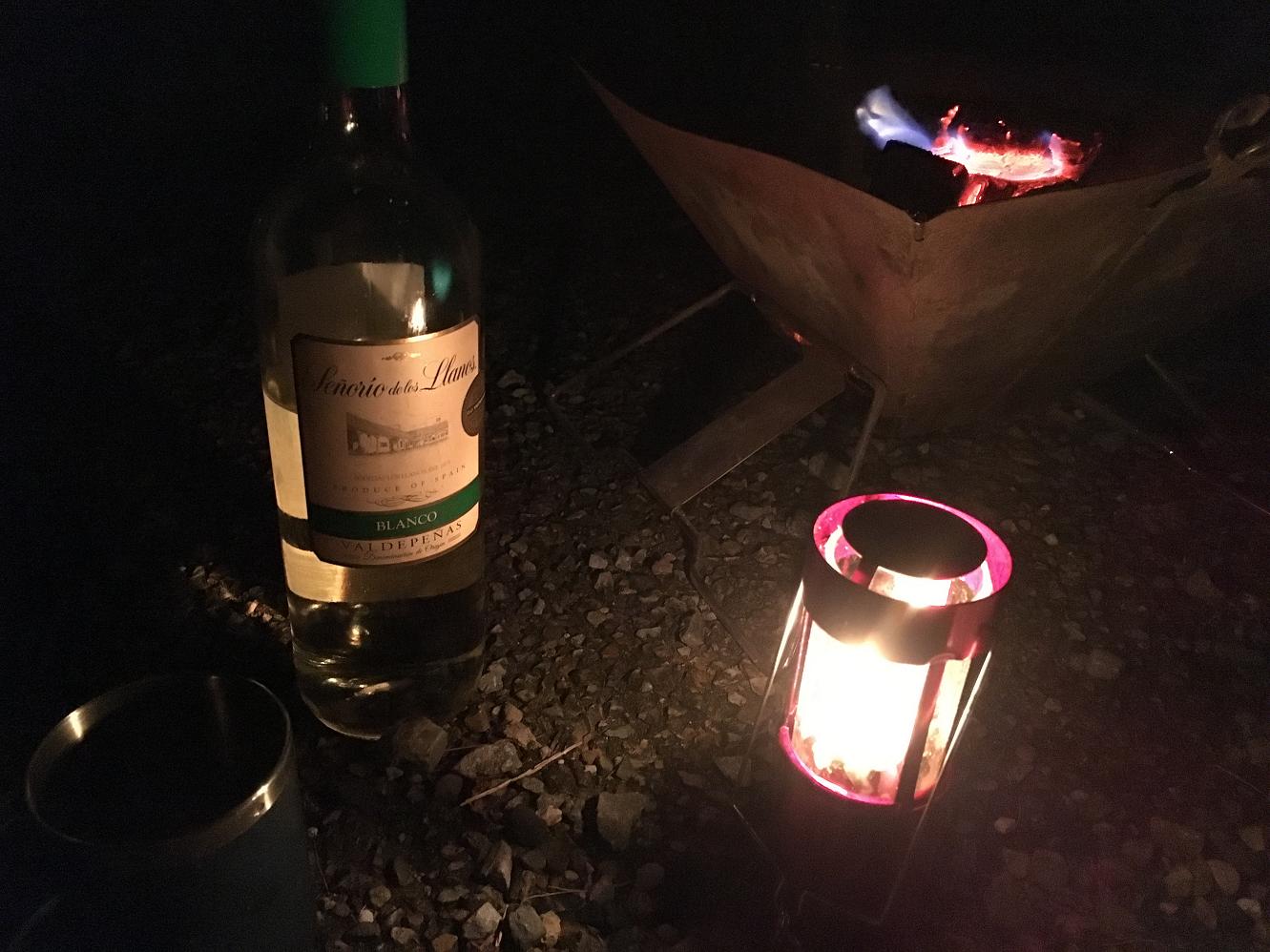 食後は380円のしゃびしゃびに薄い味の安ワインで焚火を楽しむ。