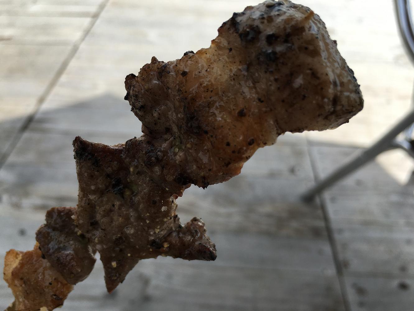 まちの市場 こってコテいけだ で休憩、猪肉串。