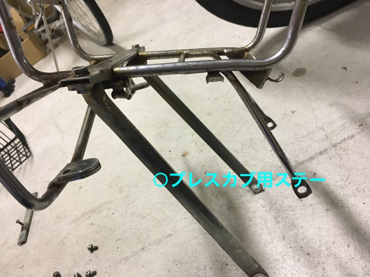 プレスカブの大型キャリアにはプレスカブ専用のステーがあり、通常のスーパーカブ(DXやSTDやカスタム)にはなくてプレスカブにしかないフロントフォークのネジ穴で固定されています。