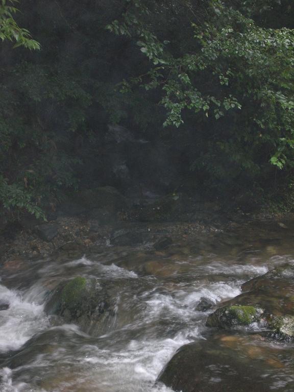 カッパを着ずに、時折の本降りに途中途中で道端の木陰に隠れるように雨宿りしながら移動。